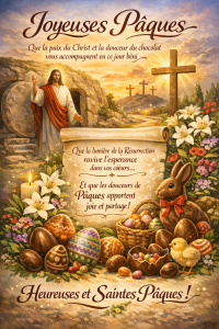 Que cette fête vous apporte paix intérieure, joie partagée et douceurs bien méritées. Que la lumière de Pâques éclaire vos journées et que chaque morceau de chocolat vous rappelle qu’il existe toujours une raison de sourire.