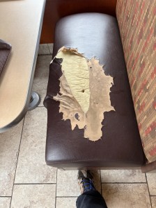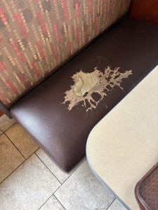 Comment peut-on recevoir une clientèle dans un tel environnement qui est repoussant d’une certaine manière. Les coussins sont non seulement déchirés, mais laissent voir la mousse. Ça ne datait pas d’hier assurément.