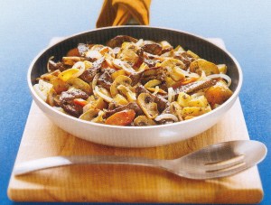 Incorporer les champignons, les oignons, la vinaigrette et la viande puis faire revenir à feu vif 5 minutes ou jusqu’à ce que tout soit chaud.