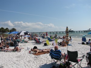 Le beau temps aidant, l’appel de la plage nous invite et hier nous semblait la meilleure journée pour s’y rendre. Nous avons choisi la plage de Fort Myers, même si on savait qu’on allait devoir affronter de gros bouchons de circulation. Cette plage est sur une île donc, une seule route s’y rend et il faut traverser un pont. Comme les infrastructures se développent moins vite que la démographie ici, c’est une situation habituelle qu’on subit depuis notre arrivée en 2005. Le beau côté c’est que nous avons traversé le boulevard McGregor, une des plus belles artères de la ville, avec ses majestueux palmiers qui se dressent aux bordures de l’allée.