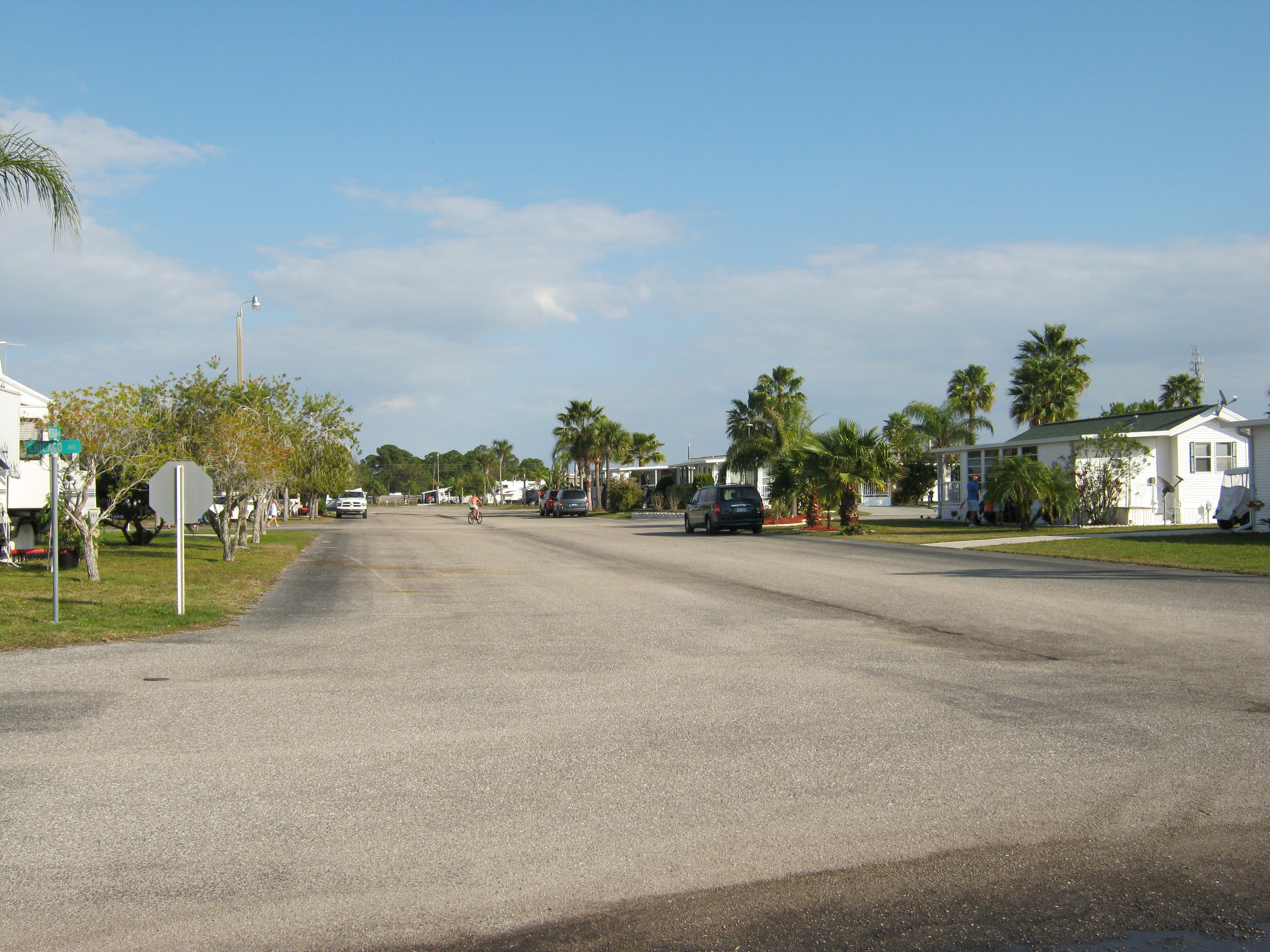 Aujourd’hui, petit tour de camion pour explorer Port Charlotte, à 45 minutes au nord de notre camping. Nous visitons le Harbor Lakes RV Resort, de la chaîne Encore, où séjournent une clientèle québécoise à 50% durant les mois d’hiver. Ce qui nous étonne, dès qu’on s’y promène, c’est la largeur des rues. Sans blague et sans exagération, elles sont plus larges qu’une autoroute à deux voies. C’est hallucinant et ça donne un panorama dégagé au maximum. Ma caravane, jumelé au camion, fait 50 pieds et je suis sûr que stationné en travers de la rue, je n’obstrue même pas le passage.