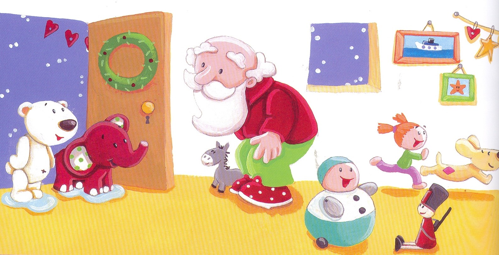 Derrière le bonhomme, Muscade et Papou aperçurent des poupées qui jouaient à cache-cache, des petits soldats qui jouaient aux dames, des ours en peluche qui jouaient du tambour et des centaines de vieux jouets en train de rire et s’amuser. Alors l’ours et l’éléphant se regardèrent, heureux. Leur voyage était fini! Ils avaient enfin trouvé le pays des vieux jouets!