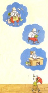 Cette fois le père Noël est en train d’emballer les jouets. Manon fronce les sourcils :