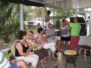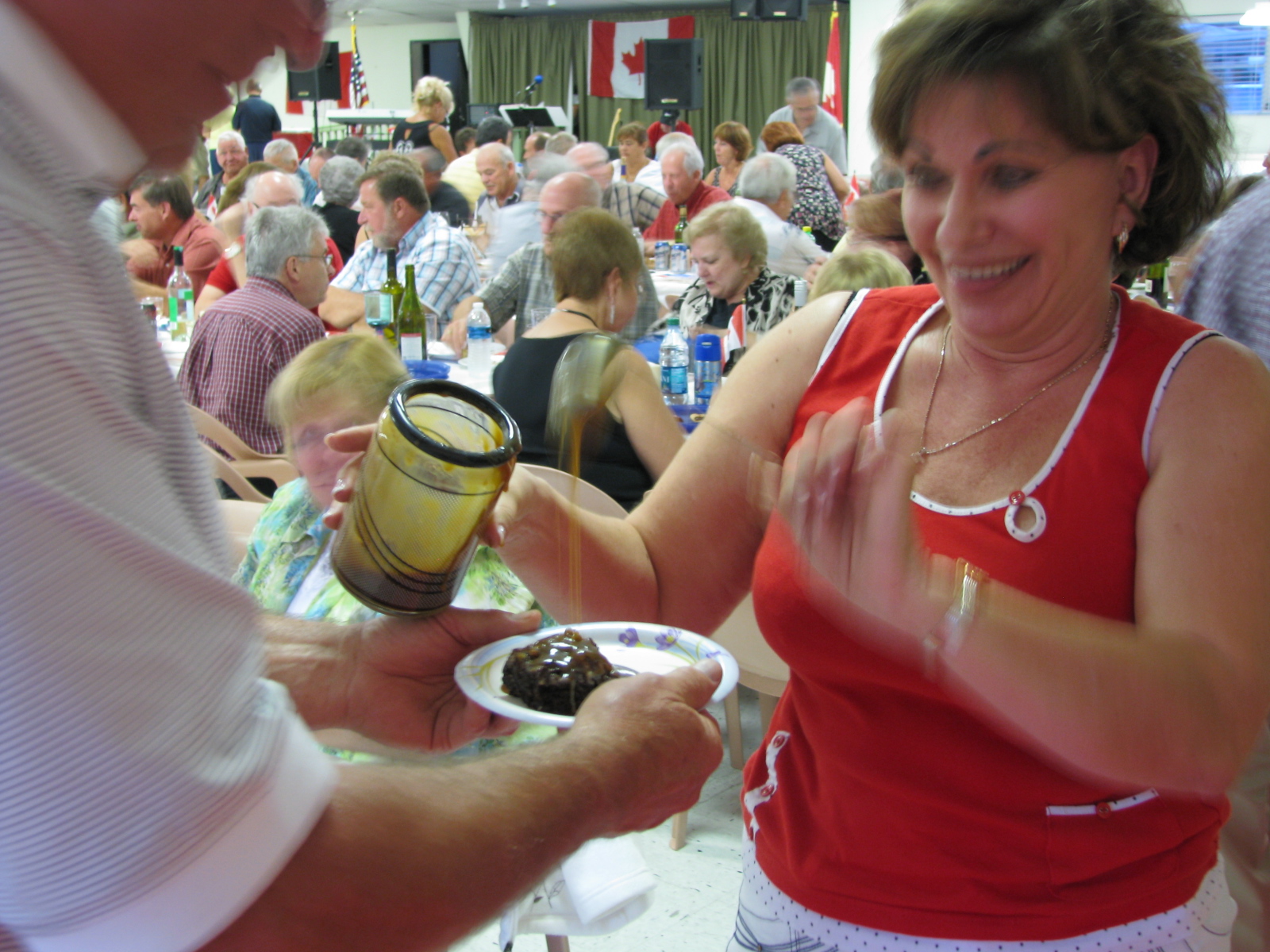 Depuis mon dernier billet sur le voyage, nous n’avons pas eu le temps de chômer. Jeudi, plus de 250 canadiens, rien à voir avec l’équipe moribonde de hockey, se réunissaient pour le traditionnel potluck. Un festin collectif que chacune des tables de 24 convives se partagent dans la plus cordiale camaraderie. Murielle et Francine s’occupaient de notre tablée où le choix s’était arrêté sur de la pizza. Pas besoin de vous dire que Papa John, la pizzéria du coin, a fait des affaires d’or. Pour le dessert, des petits brownies, subtilement arrosés de la copieuse et délicieuse sauce au caramel de Murielle, ont tôt fait de combler les bibites à sucre. C’est finalement au son de la musique du band de service que tout ce beau monde s’est occupé d’activer la digestion et de faire fondre quelques calories indésirables. Une belle réussite.