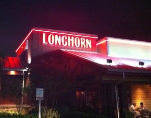 Tout ça pour vous présenter le restaurant qu’on a visité hier soir avec Lise et Gilles. Le Longhorn Steakhouse, sur la 41 à Fort Myers. Comme son nom l’indique, la décoration s’inspire des cowboys et du bétail à cornes dont on retrouve des silhouettes et tableaux un peu partout. Le bois est prédominant dans l’établissement et on se sent vraiment au pays des cowboys. L’annonce du restaurant dans le journal local m’avait ouvert l’appétit et je me suis dis qu’un restaurant du genre devait bien être un must, pour déguster un bon biftek savoureux. J’avais frappé dans le mille. Dès qu’on ouvre le menu, les papilles gustatives se mettent à saliver et croyez-moi, les steaks sont délicieux et savoureux. Ils offrent un Porterhouse de 20 onces, pour 24,95$ et qui joue avec mes babines, pas pour rire. Je me promets bien à ma prochaine visite, de le commander. Je me sens d’attaque!