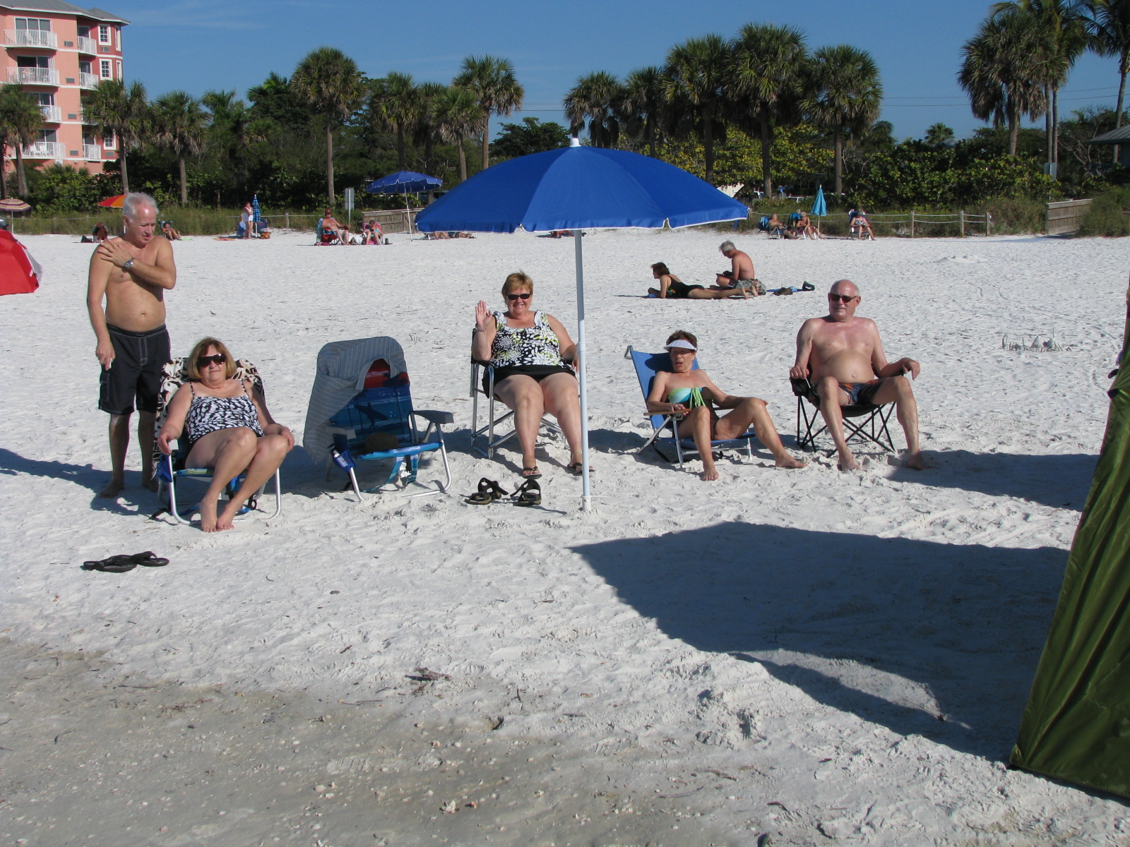 Ce vendredi marquait notre première visite à la plage cette saison. Vous me direz qu’on en a mis du temps mais voilà, on est occupé. Même pas le temps d’avoir des mauvaises pensées. Avec Lise et Gilles, Louise et moi prenions le chemin de Fort Myers Beach, pour initier Carole et Marcel à l’air salin de la Floride sous les 30°C et du soleil à faire rougir rapidement les peaux blanches nordiques. Un peu de crème solaire et voilà qu’on se laisse caresser par la légère brise du large. Avec nos condos bien piqués dans le sable, on a dû répondre une bonne demie douzaine de fois aux gens qui voulaient savoir où nous nous étions procurés pareils abris solaires. La journée a été tellement éprouvante que le soir venu, point besoin de berceuse pour s’endormir. La tête déposée doucement sur l’oreiller, Morphée nous entourait de ses bras envoutants. C’est épuisant le grand air !