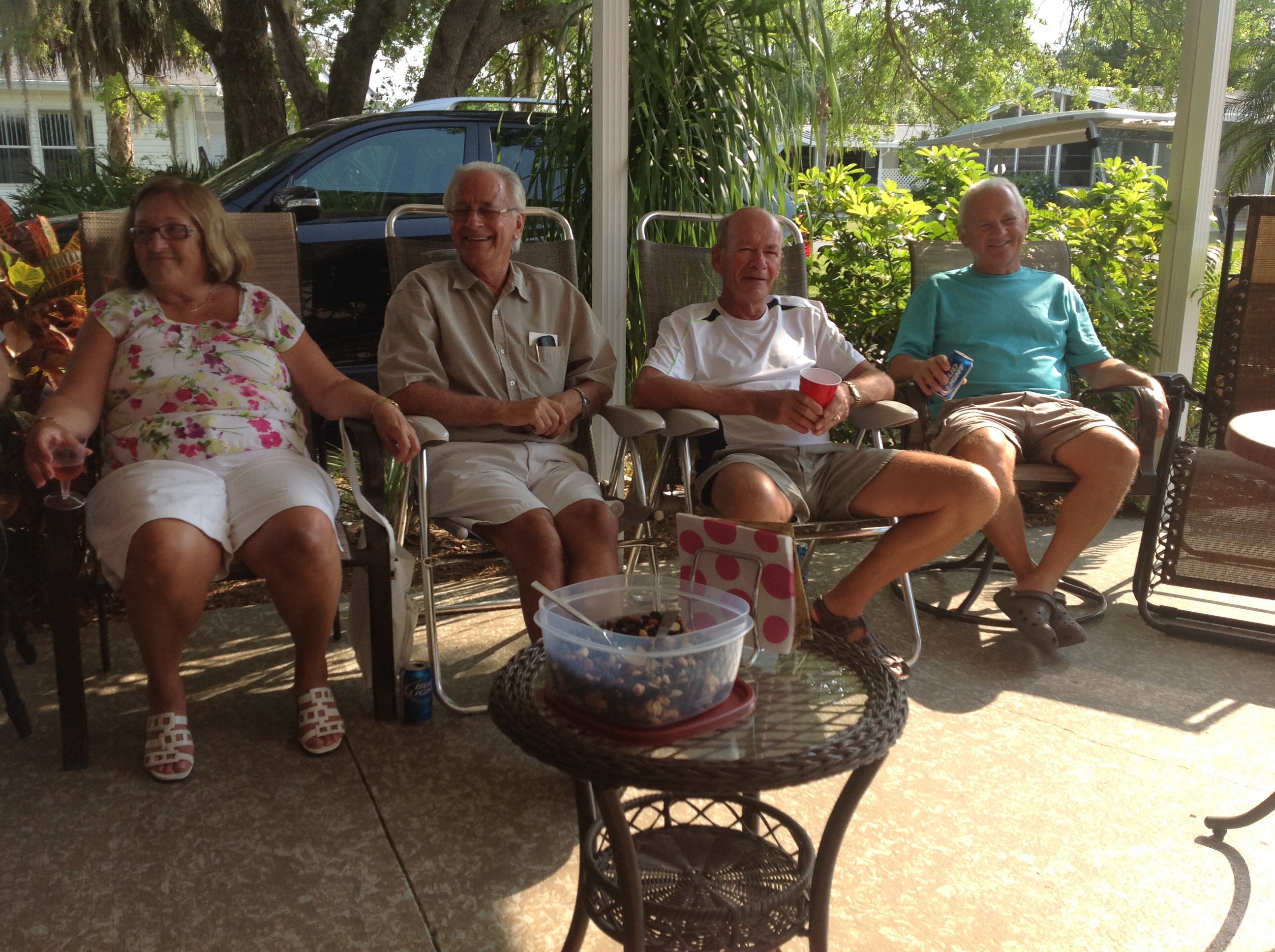 Le soleil était de la partie avec ses quelques nuages et sa température chaude, pour l’apéro dans le capharnaüm des discussions animées. Et non, on ne pouvait entendre une mouche voler. Nos hôtes avaient disposé, dans la screen room, des chaises et tables joliment décorées de centres de table sortis tout droit de l’imagination fertile de Carole, pour qui la décoration n’a plus de secret, ayant tombé dedans dans sa jeunesse. À partir de rien, elle fait des merveilles. L’ami Mario lui, s’occupait grandement à satisfaire tout son monde, distribuant croustilles de toutes sortes et rafraîchissements. Simone, la voisine acadienne d’en face, s’amenait avec Gérard et la parenté pour compléter le groupe, avec son assiette d’amuse-gueules à la chair de crabes, de son cru. La fête était lancée.