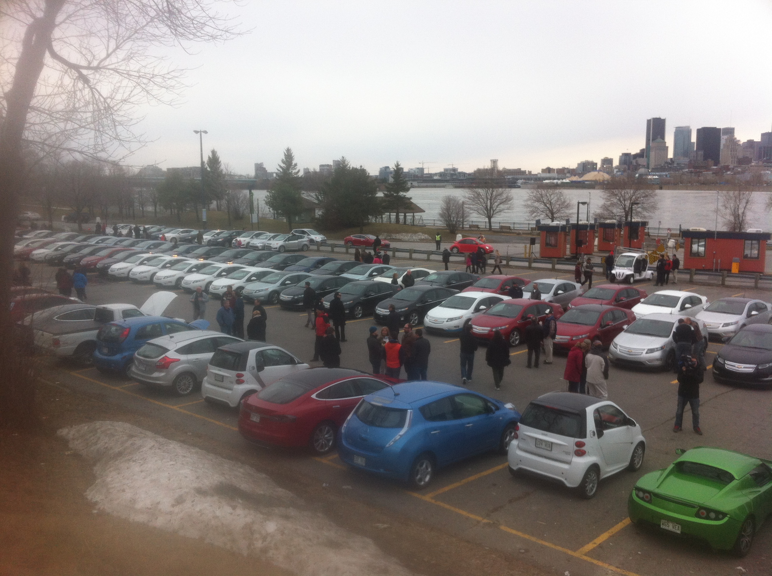 Dès 15h30, les bolides silencieux s’amenaient sur le stationnement P8, près de La Ronde, puis garés bien alignés aux endroits prévus, guidés par une équipe de signaleurs. Le temps frais n’a pas empêché les gens de se déplacer et de discuter, entre parfaits inconnus, de véhicules verts qui sont, sans conteste, en effervescence.