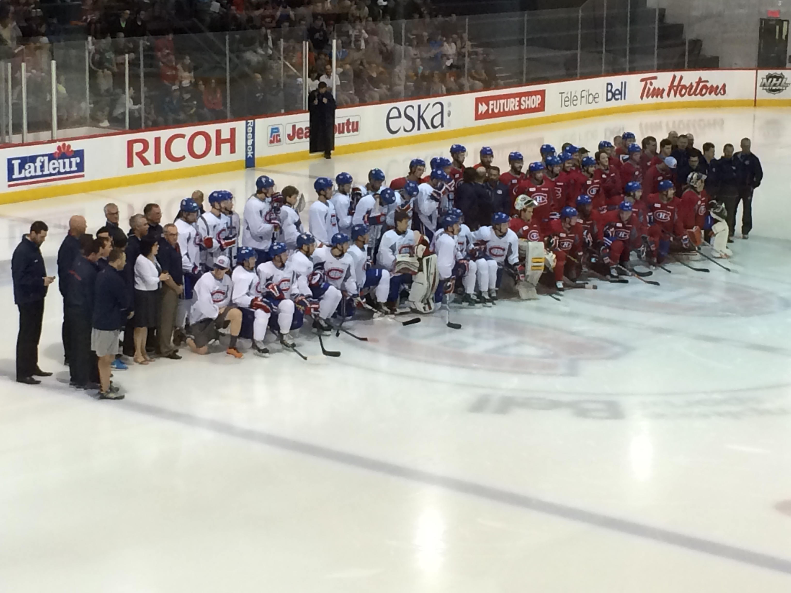 Entre les périodes, Pierre-Olivier se rendait près des bandes pour toucher les gants des joueurs à leur retour sur la glace. Un vrai groupi ! Finalement, les Blancs ont eu le meilleur sur les Rouges en l’emportant 8 à 2. Après une poignée de mains protocolaire au centre de la glace, les joueurs ont levé leurs bâtons pour saluer la foule, sous ses applaudissements nourris. Me retournant, j’ai aperçu et serré la pince à Shayne Corson, ex-joueurs des Canadiens, dont le fils Dylan, faisait partie des joueurs présents au camp.
