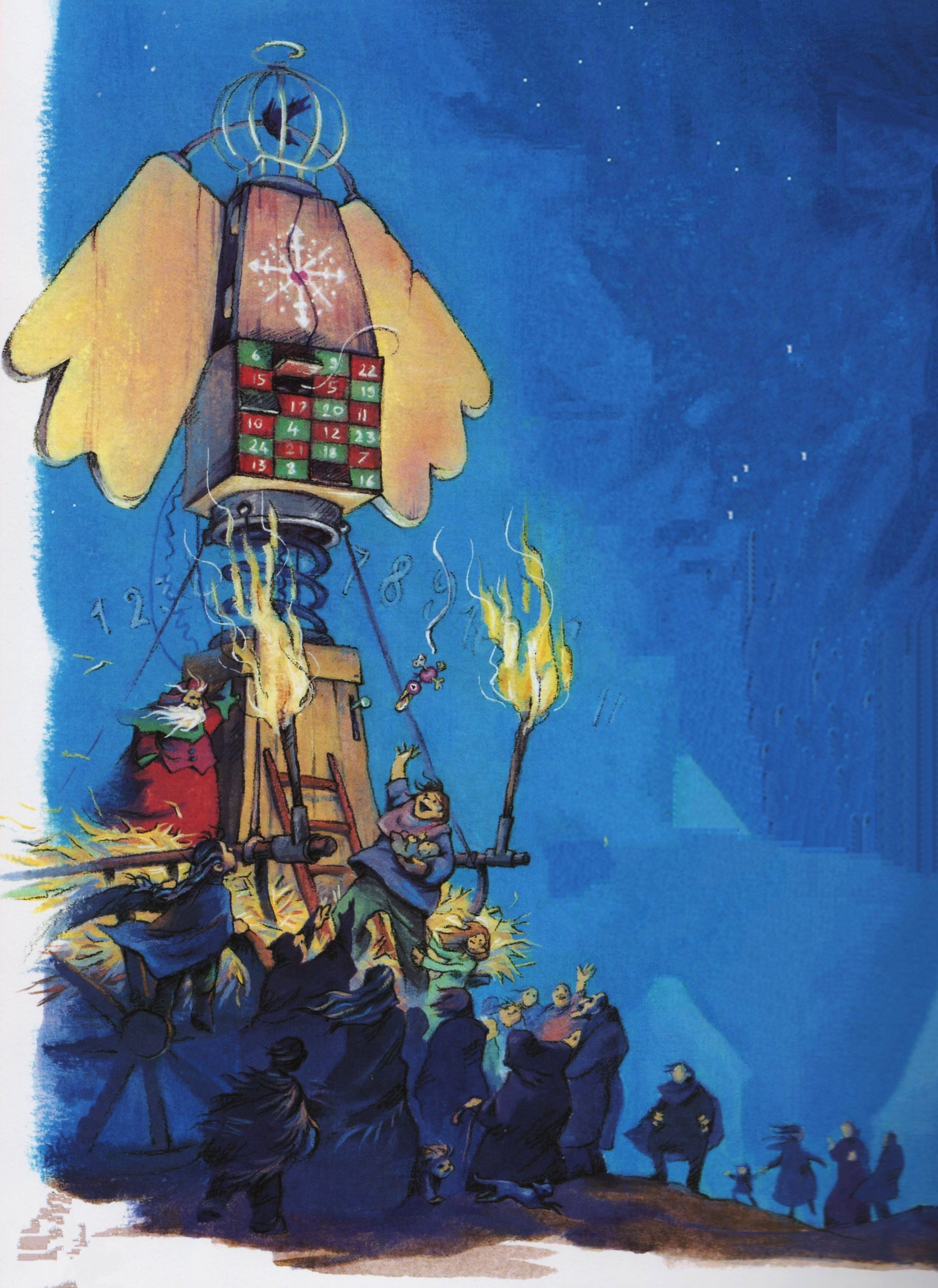 Le soir suivant, veille de Noël, Enguerran le cruel revint. À huit heures, la machine fit du bruit, le dernier casier s’ouvrit, et un oiseau en sortit, tenant dans son bec une lourde bourse d’or. Mais c’était un véritable oiseau et il s’envola dans les airs, avec les vingt-quatre pièces d’or. Enguerran essaya d’attraper l’oiseau, en vain.