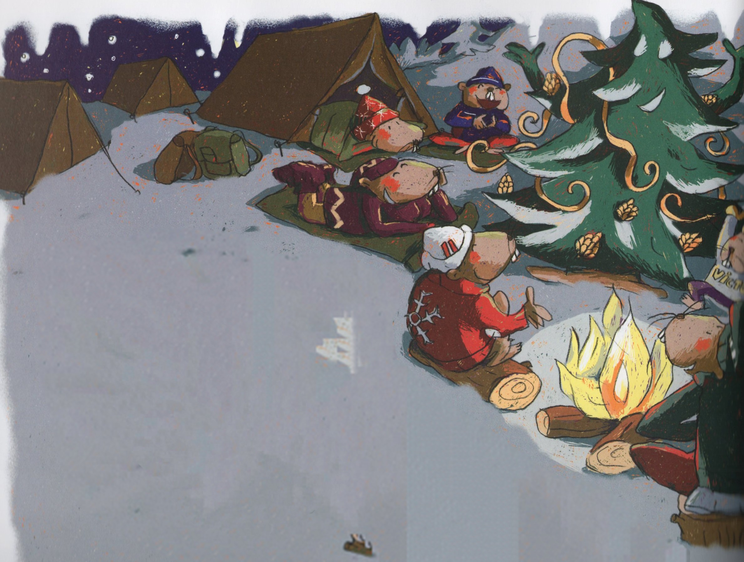 C’est ainsi que tous les castors montèrent leurs tentes autour du sapin qu’on décora de pommes de pin et de serpentins de copeaux de bois. On fit un grand feu, on y grilla des saucisses, on chanta. Grand castor raconta des histoires de castors et le sapin, des histoires de sapins.