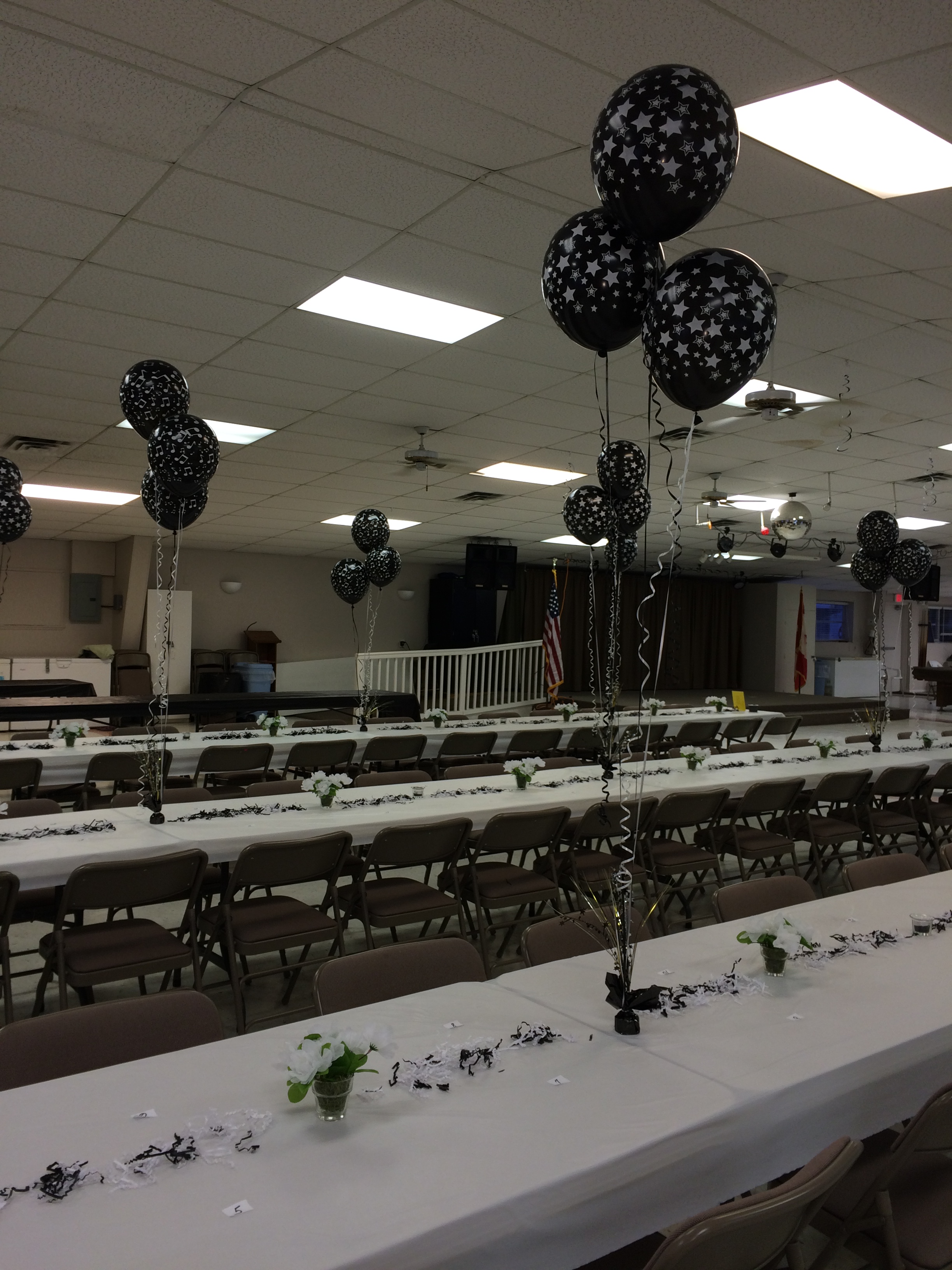 Rien n’a été laissé au hasard et pour l’occasion, Francine avait sollicité l’expertise de Carole Rhéaume, une amie designer chevronnée, pour la décoration de la salle de bal tout en respectant le thème du noir et blanc. Dès l’heure du dîner, une ruche de fidèles bénévoles s’affairait à embellir la salle de ballons thématiques judicieusement disposés en bouquets sur les tables nappées, agrémentées de bougies et de rognures de papiers, étalées au centre. Même le plafond de la salle laissait pendre quelques serpentins ici et là. À l’entrée, il fallait traverser une allée bordée de bougies illuminées dans des sacs de papiers au bout duquel se dressait l’affiche officielle, ornée de ballons, annonçant le bal.