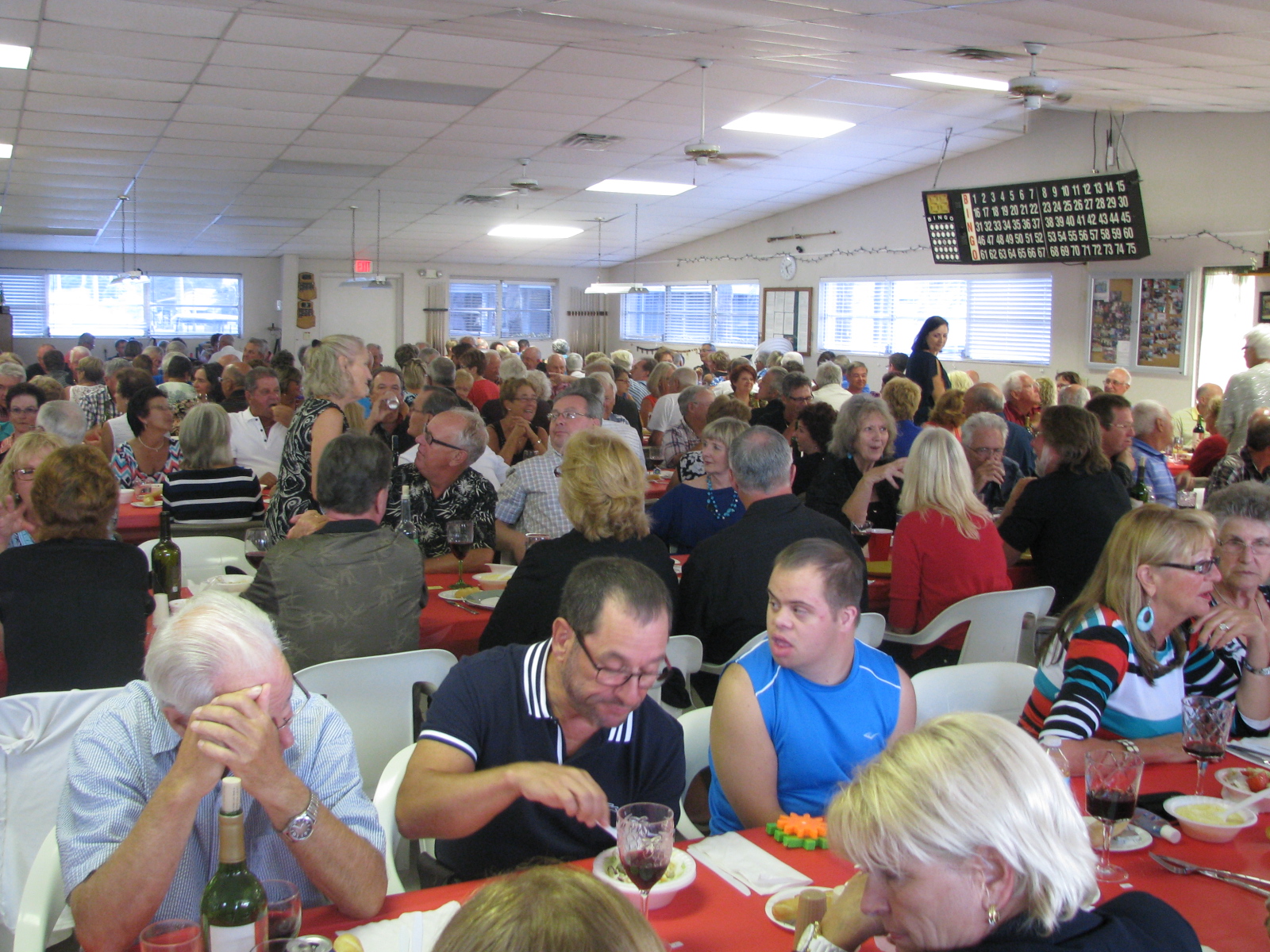 2015-03-28 003C’est ainsi qu’on peut traduire le farewell diner, dernier souper de la présente migration au pays des gougounes. Hier soir, pour cette occasion, la salle était complète. Sold Out comme on dit! D’une capacité de 473 personnes, 468 convives prenaient place dès 16 heures pour ce traditionnel dernier repas communautaire.