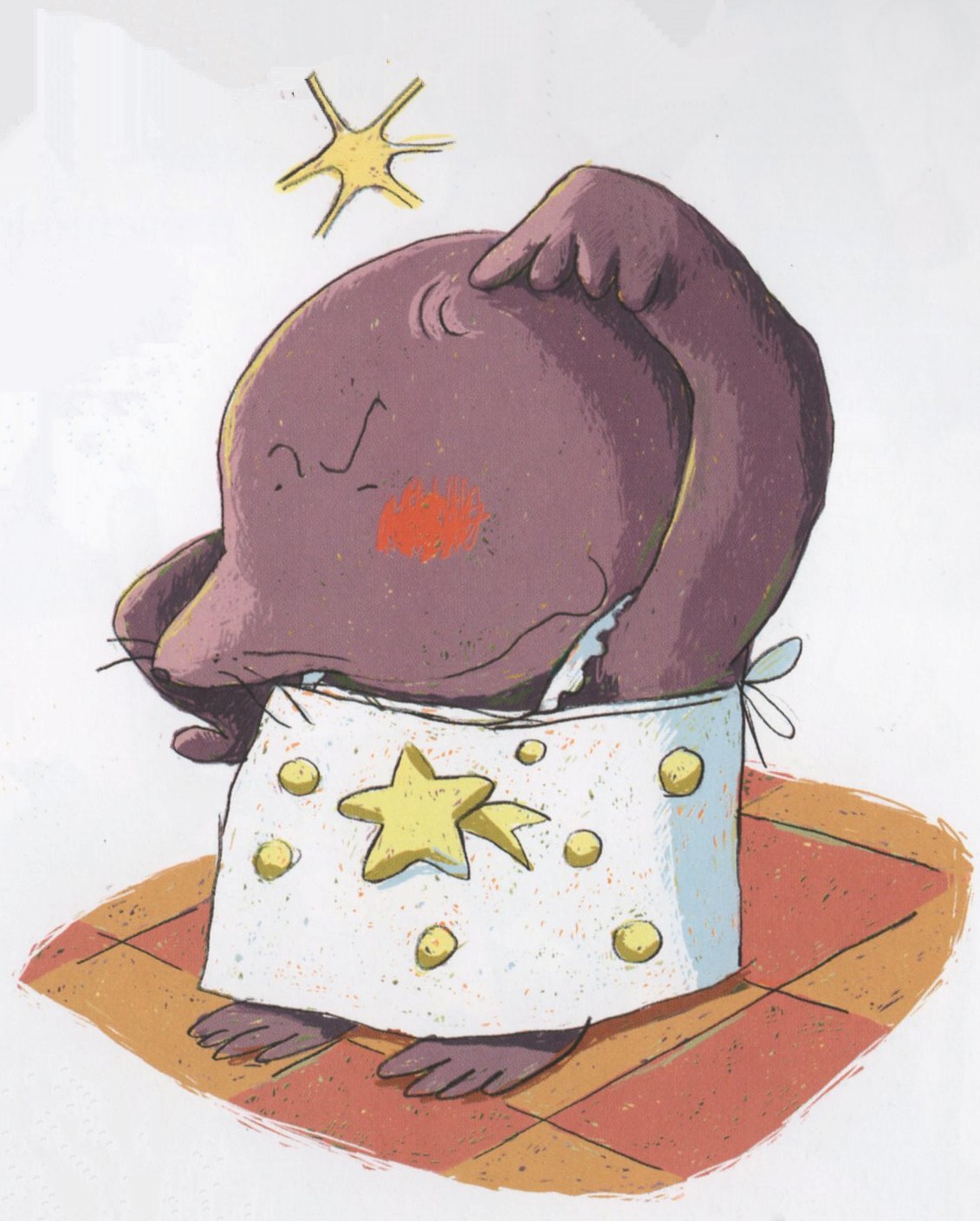 Odette se presse et dresse une belle table de fête. Dring! La sonnette de la galerie retentit. Hubert le lièvre, Jasmine la fouine, Marinette la belette, tous ses amis sont là. À peine arrivés, ils se regardent étonnés. Sans ses lunettes, Odette s’est trompée. Elle a servi le pain d’épices sur une assiette ébréchée et présenté les sablés et les truffes dans la gamelle du chien!