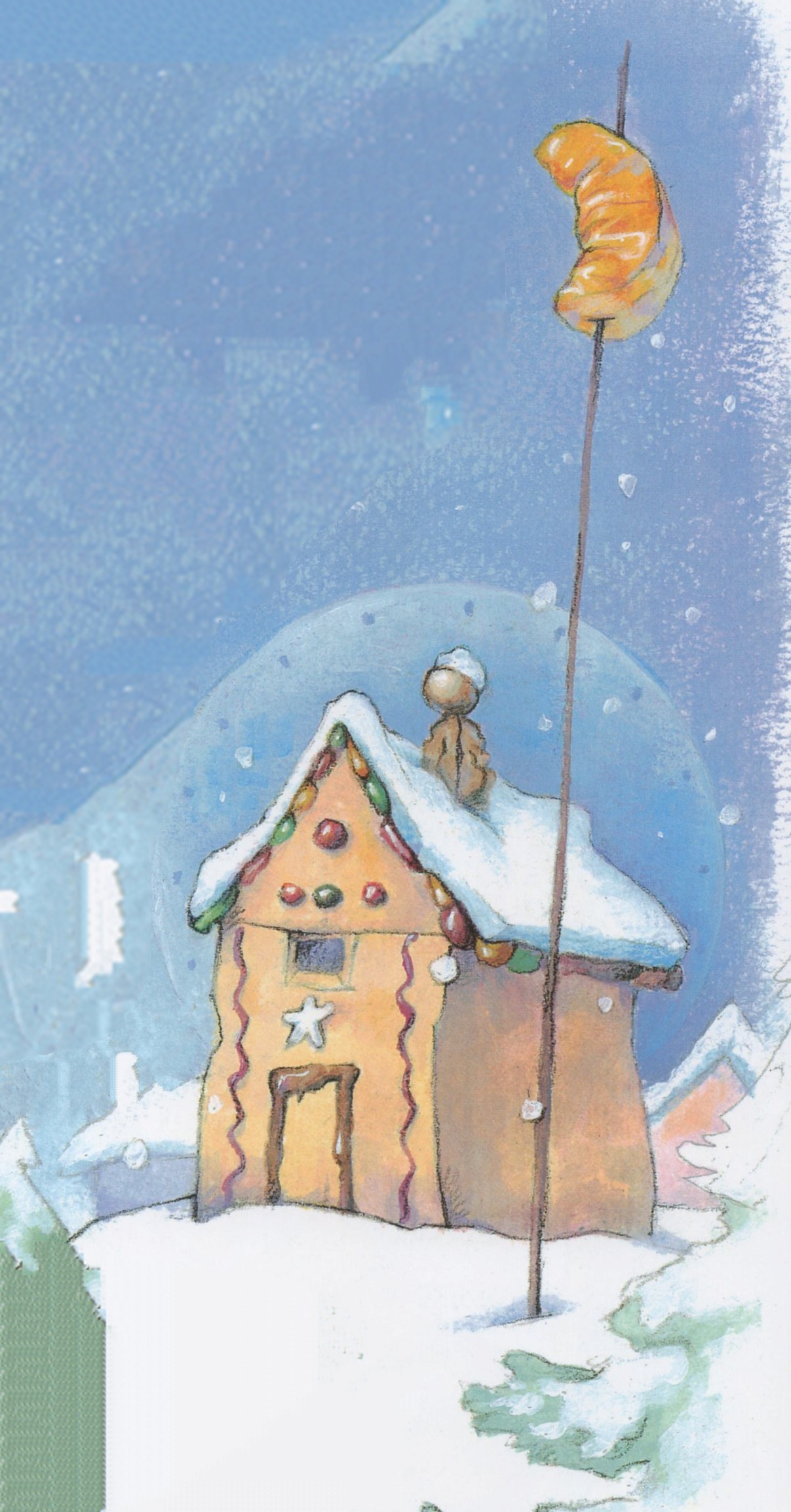 En un clin d’œil, Margot dispose noix et noisettes sur le toit en fruits confits. Avec un quartier d’orange, voilà Dame Lune qui illumine la nuit de Noël. Le petit prince est content maintenant ! Mais chut, voilà mamie Berthe qui entre dans la cuisine. Psitt ! D’un coup, le petit prince s’évanouit dans les airs. Mamie Berthe s’écrie :