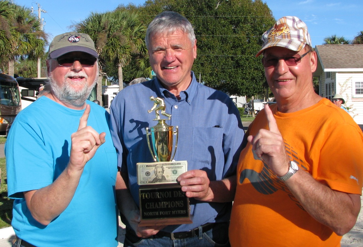 L’équipe de Marcel Tassé et ses acolytes Gilles Rochefort et Daniel Boutin ont remporté les grands honneurs et la bourse de 150$, lors du tournoi des champions de pétanque 2016, rééditant l’exploit de l’année dernière. Cette compétition réservée à l’élite de la boule de métal, en était aujourd’hui à sa deuxième édition et 14 équipes disputaient une chaude lutte pour l’obtention des trois premières places et les bourses en jeu. Dame nature s’est montrée coopérante avec son mercure de 24°C sous un soleil radieux.