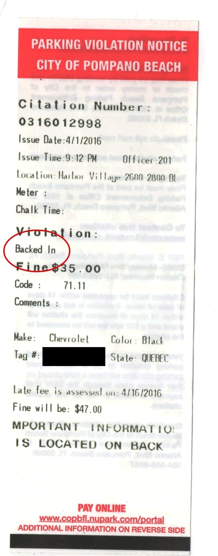 Saviez-vous qu’il existe une réglementation qui interdit de se stationner à reculons dans un stationnement public en Floride, ce qu’on appelle communément un back in. La rumeur était venue à mon oreille depuis quelques mois déjà et là, j’ai la confirmation. Mon ami Marcel s’est vu décerner une contravention de 35U$, à Pompano Beach, en pleine journée du poisson d’avril qui, malheureusement n’en n’était pas un. Un ticket pour avoir stationné à reculons dans un stationnement public. Assez insolite merci !