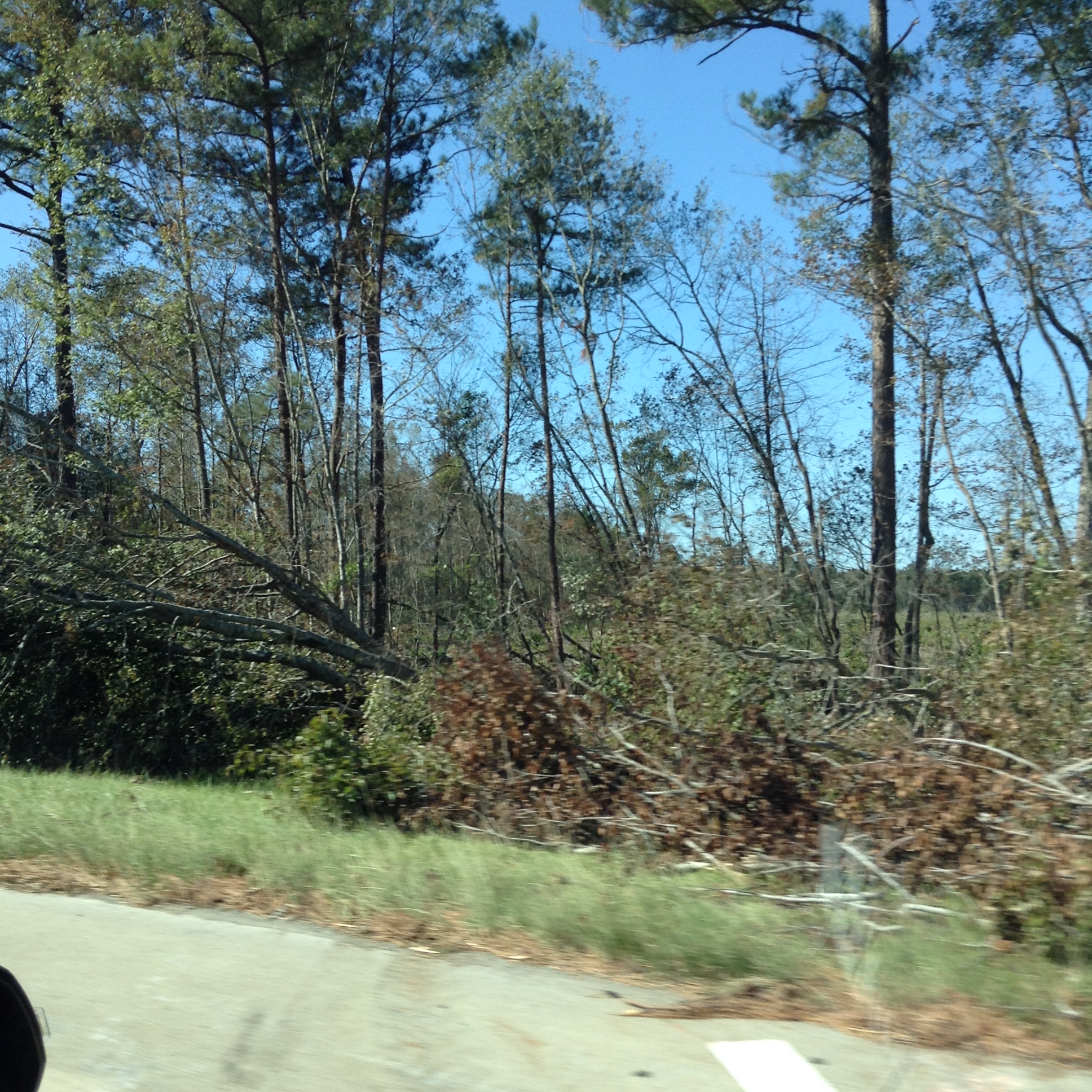 Par contre, en Caroline du Sud, le pavé n’a pas trop souffert mais les arbres, par milliers, jonchent encore les bordures de chaque côté de l’I-95, sur les 320 kilomètres de sa longueur. D’ailleurs, j’ai pris ce cliché d’arbres tombés et imaginez cette séquence des centaines de fois. Ils en ont pour des mois à tout dégager. À ces arbres il faut ajouter également d’autres garde-fous, des panneaux routiers complètement tordus et même des affiches publicitaires en toiles qui se sont amalgamées à travers des branches d’arbres encore debout. Mince consolation pour les habitués de South of the Border, la tour de Pedro surmontée d’un sombrero, a résisté à Matthew.
