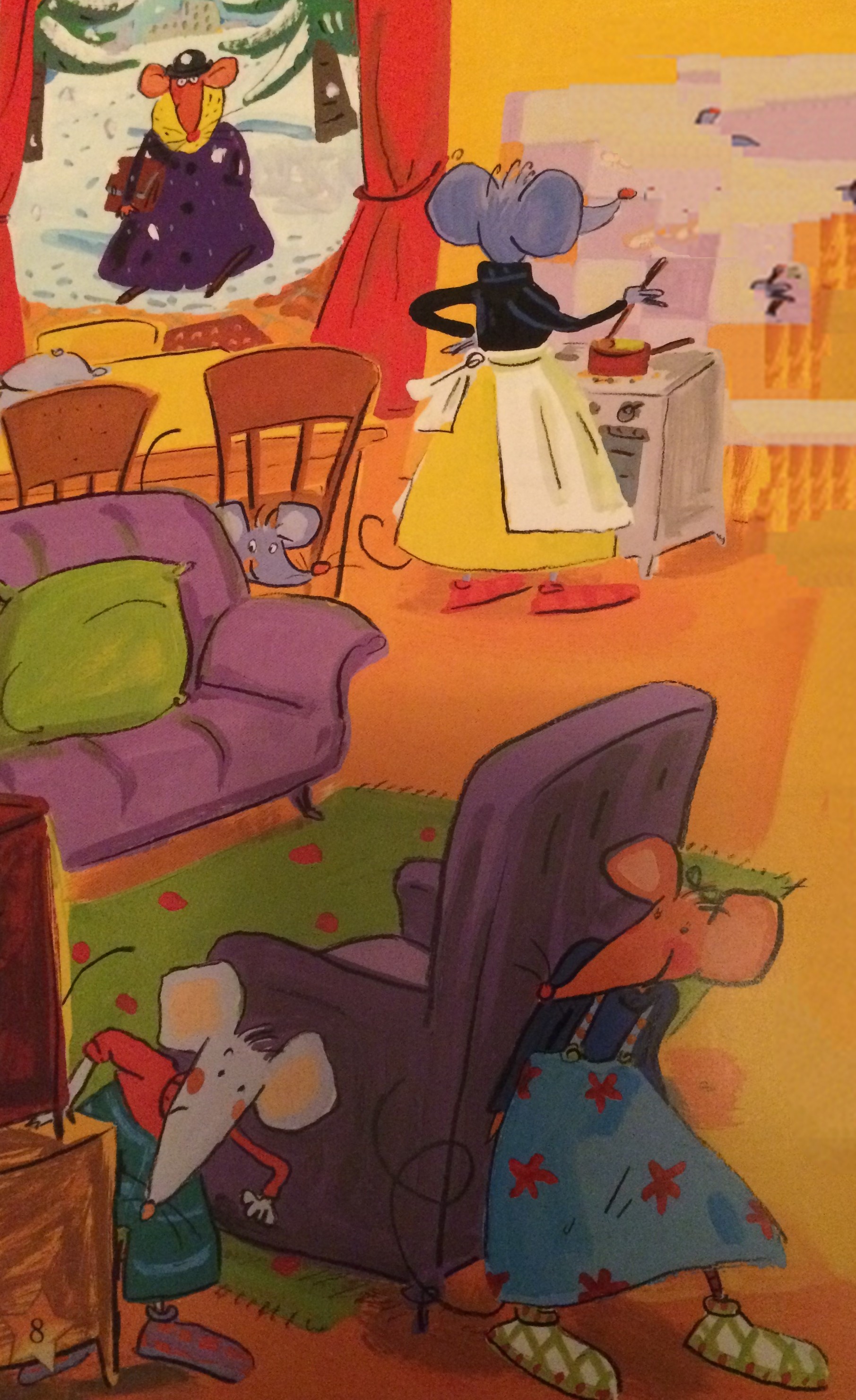 – Mais non, dit Maman Mulot en le prenant sur ses genoux, regarde ! Quand tu mangeras ce grain-là, nous cuirons des sablés. Quand tu mangeras celui-ci, nous irons couper le sapin. Là, nous le décorerons. Et à ce grain-ci, nous installerons la crèche… Et encore là, nous écrirons la lettre au Père Noël.