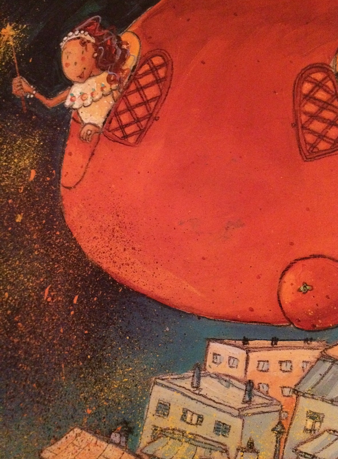 Quand l’heure de rentrer est venue, Coline jette un dernier regard en arrière et, en un éclair, l’orange file vers la montagne. Par la fenêtre, Coline envoie des baisers par milliers à sa marraine, la fée. L’orange magique disparaît déjà dans le ciel et le soleil commence à poindre. C’est alors que Coline remarque, dans le champ du voisin, un cheval gris qu’elle n’avait jamais vu. Son dos est couvert de poussière d’étoile…