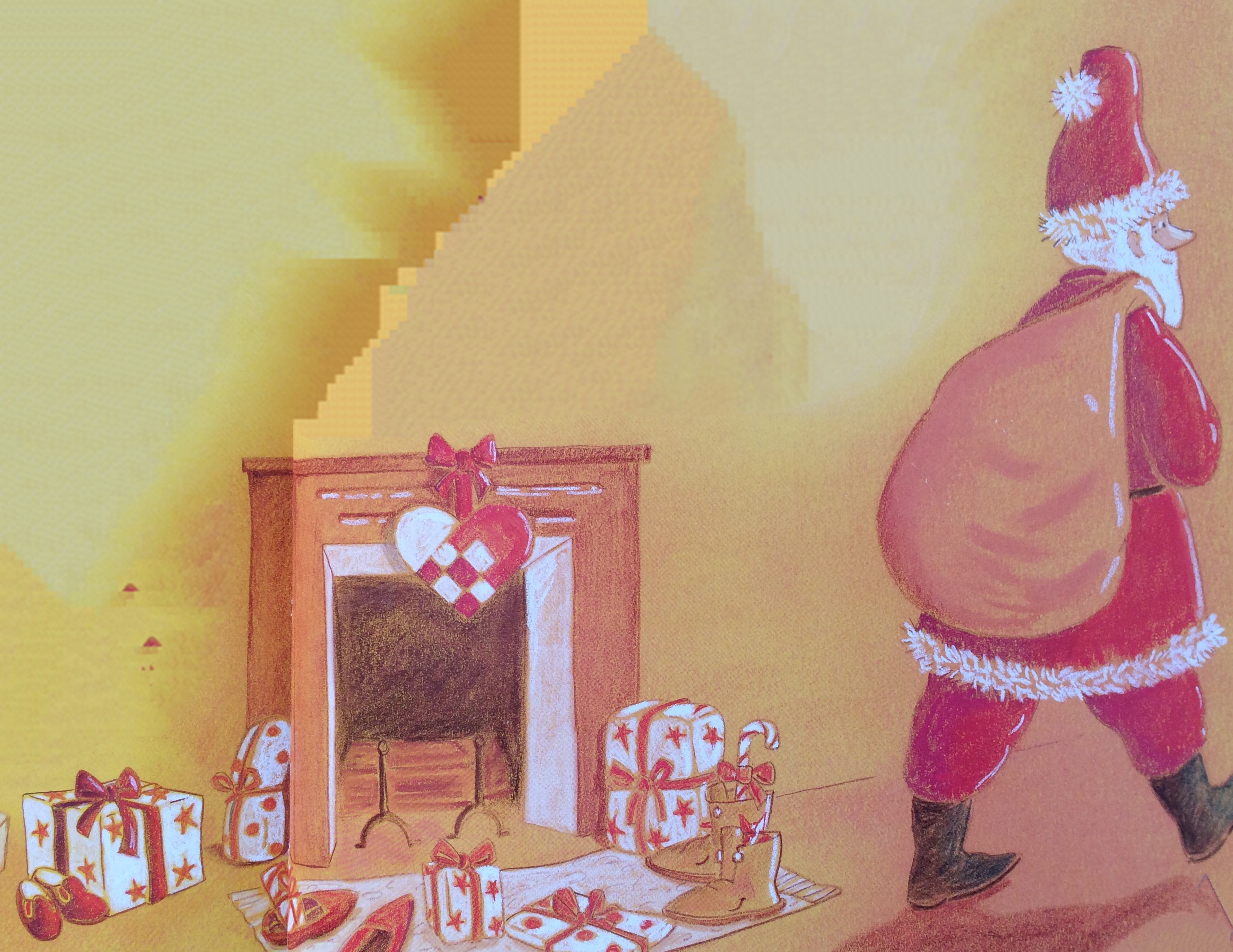 La semelle trépidante et les lacets frétillants, Droite et Gauche se tordent le cou pour apercevoir le Père Noël. Une paire de bottes rouges s’avance dans la pénombre du salon… Bientôt, Droite sent la douceur d’un ours en peluche et Gauche la fraîcheur d’un livre d’images. Et pour elles, une paire de lacets tout neufs ! Le Père Noël est déjà reparti, laissant les Godasses toutes joyeuses !
