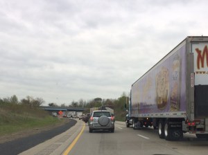 Pour revenir à cette journée, on a eu droit à quelques bouchons de courte durée, à cause de travaux routiers. Les nuages, gouttelettes de pluie et un soleil timide ont, comme à la chaise musicale, tenté de s’imposer sans faire de vainqueur. Cependant, c’était bien pour les bagages qui n’ont pas eu à se faire rôtir. Ma douce tient son rôle de navigateur de main de maître… maîtresse serait plus appropriée. Le Next Exit n’a qu’à bien se tenir pour fournir l’information demandée. Elle sait où chercher; le prochain ravitaillement d’essence, la prochaine pose pipi, les haltes-repas, tout est sous son contrôle et au bout des doigts. Elle est vraiment une co-pilote douée et compétente. Croyez-moi sur parole. Elle n’est pas à louer… je vais faire comme Bombardier, la garder et hausser effrontément son salaire.
