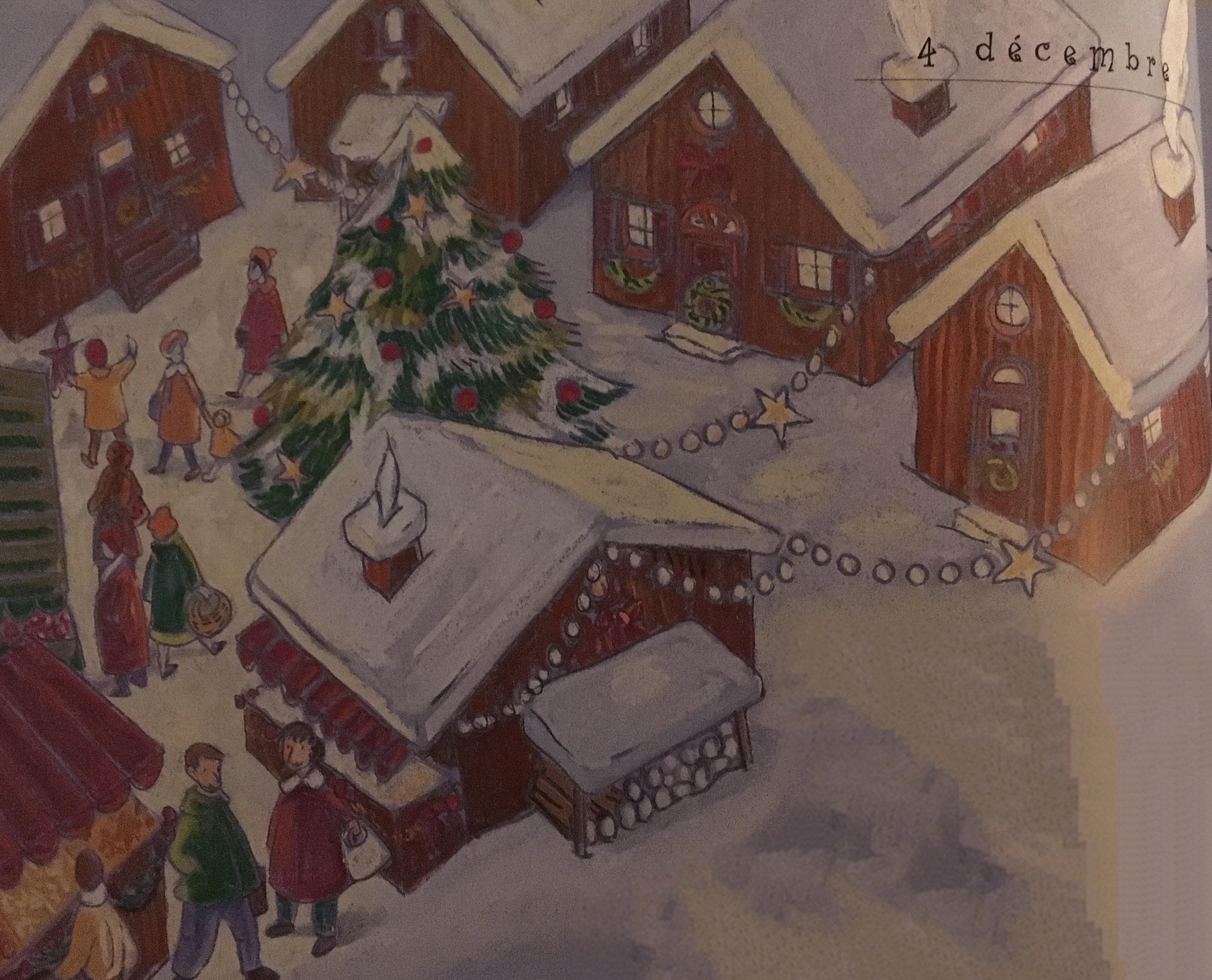 Tout le monde se met à chercher. Dans les sapins, sous les tables, derrière les échoppes, dans les cartons… rien. Louise est très déçue. Maintenant il est tard, il faut rentrer! Elle s’engage dans une petite rue étroite, quand tout à coup, elle fronce le nez : on jurerait une odeur de pain d’épice! Elle s’approche d’une petite maison éclairée.