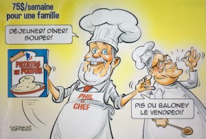 Le premier ministre Philippe Couillard croit qu’il est possible d’arriver à nourrir une famille de trois personnes pendant une semaine avec 75$. Les nuances végétales du PM ne changent rien au fait qu’il présente la pauvreté comme un défi qui peut se relever, pour peu qu’on soit prêt à sacrifier la variété des menus.