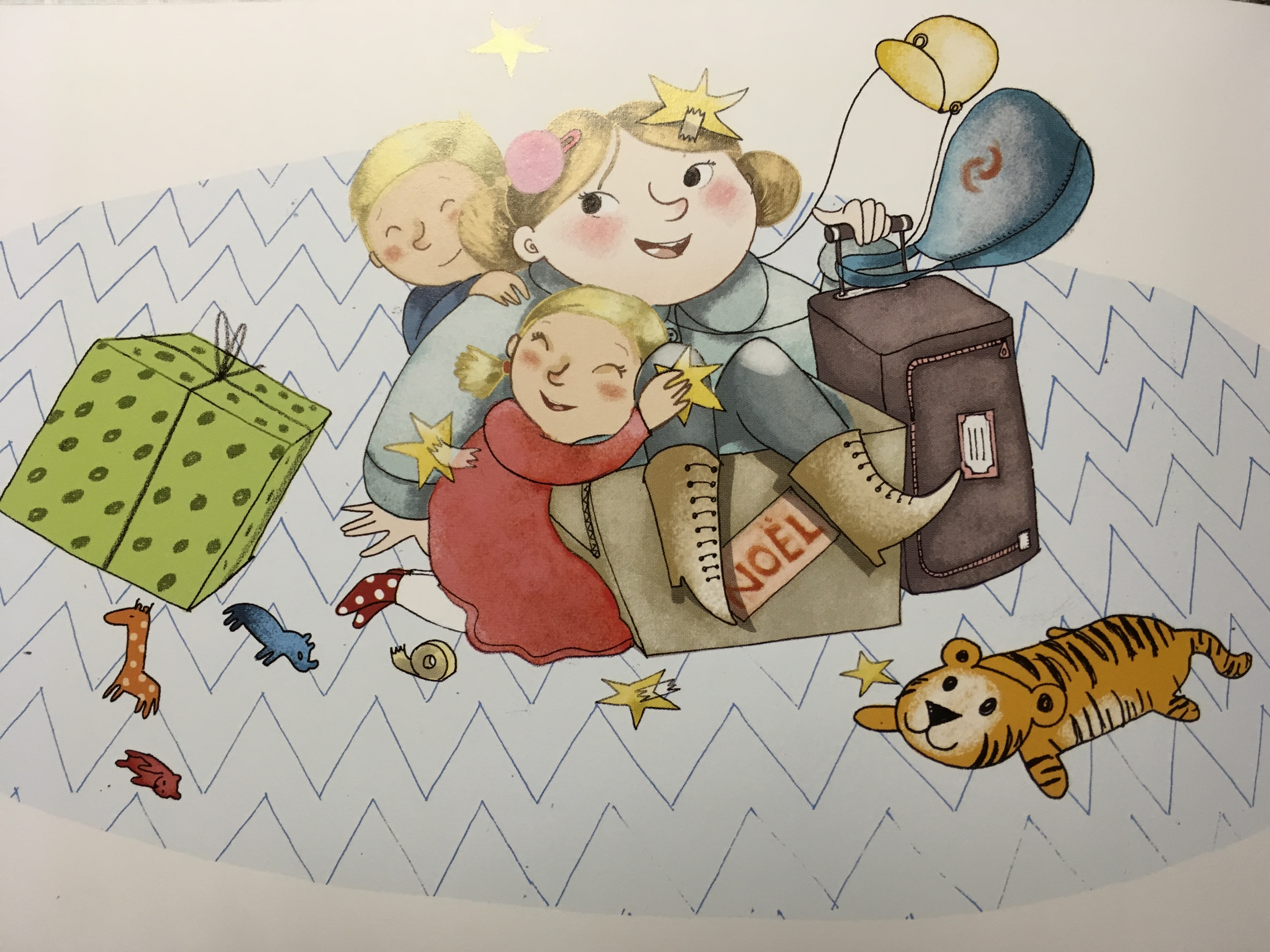 Mais ils ont pris un tel élan qu’ils lui font perdre l’équilibre ! Elle recule, recule… et se retrouve tout à coup assise, sa valise à la main, ses neveux sur les genoux, sur le carton de boules, qui fait un drôle de bruit.