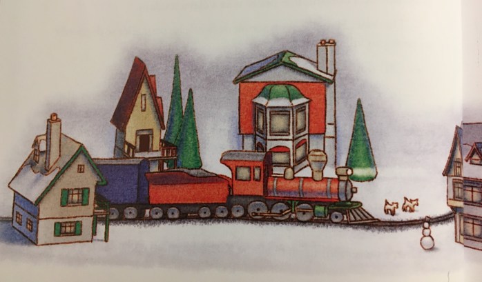C’est à ce moment précis que monsieur Roupillon se réveilla à moitié, sans doute à cause du vacarme. Tout ensommeillé, il s’en fut éteindre l’arbre de Noël et toutes les lumières de la maison pour monter ensuite se coucher dans sa chambre, sans même se demander ce qui avait pu actionner le train électrique sous le sapin. Non seulement l’arbre de Noël et le village, mais tout le salon, se trouvèrent aussitôt plongés dans l’obscurité totale. Bien sûr, le train cessa immédiatement son excursion.