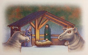 L’idée lui vint tout à coup de pénétrer dans l’église remplie de monde alors que minuit sonnait tout juste à la grande horloge du clocher. Il se faufila discrètement entre les deux portes et se dirigea à petits pas vers l’avant, en longeant le mur. Il y découvrit une grande crèche qui occupait tout le côté. Instinctivement, il scruta les personnages. Autour du petit Jésus, il remarqua de nombreux moutons sommeillant sur la paille. Sans doute des cousins lointains qu’il ne connaissait pas… Soudain, il se frotta les yeux. Non ! il ne rêvait pas, il s’agissait bel et bien de Flanelle, là, complètement endormie, le museau entre les pattes. Il s’empressa de la réveiller d’un coup de langue sur le bout de l’oreille.