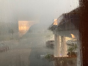 Pas question de sortir, quand on a regardé par la fenêtre de notre chambre, on pouvait voir d’énormes trombes d’eau déferlées du toit de l’hôtel en s’abattant dans le stationnement. Cette pluie diluvienne a duré tout au plus 10 minutes, mais quel déluge d’eau. D’ailleurs, la photo qui agrémente cet article démontre la vision de l’orage qu’on pouvait voir. La qualité n’est pas exceptionnelle, mais elle est bien démonstrative de l’évènement.