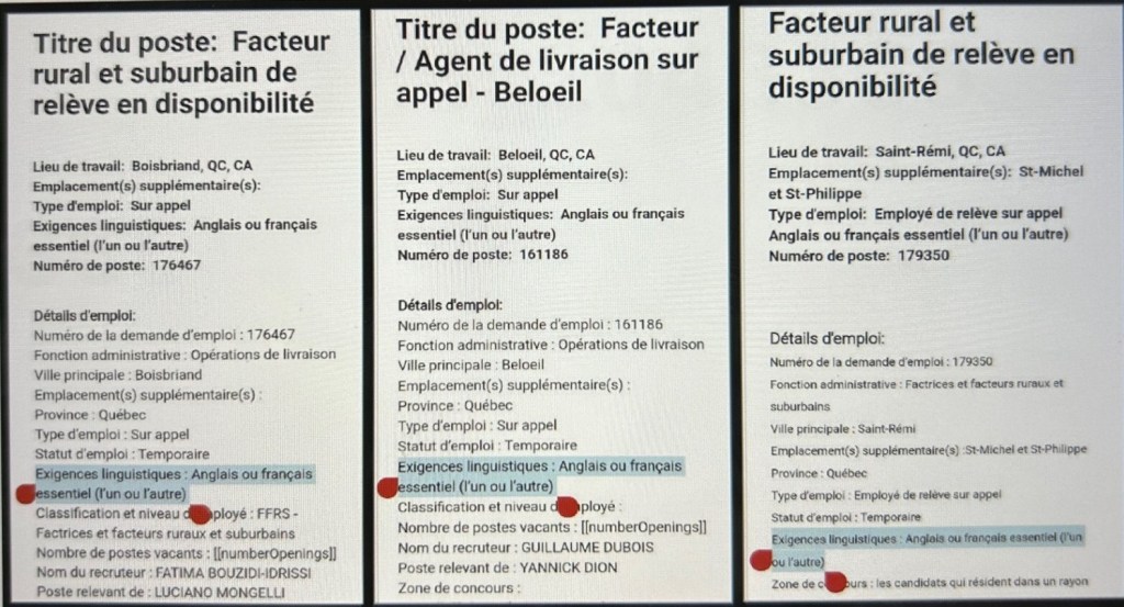 Pas besoin de parles français pour être facteur à Beloeil et à Saint-Rémi, au Québec, en 2024, même si c’est la langue maternelle de 90 % des habitants là-bas, si l’on se fie à des offres d’emploi récentes de Postes Canada.