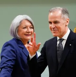 À droite, le nouveau premier ministre Mark Carney. À gauche, la gouverneure générale Mary Simon.