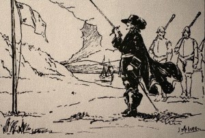 Le 3 juillet 1608, Champlain abordait au pied du cap de Québec et en présence de 28 hommes de son équipage, prit solennellement possession du pays en arborant le drapeau français.