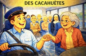 Dans un bus avec des petits vieux en route pour un pèlerinage à Sainte-Anne-de-Beaupré, une mamie tapote sur l’épaule du chauffeur et lui tend une bonne poignée de cacahuètes.