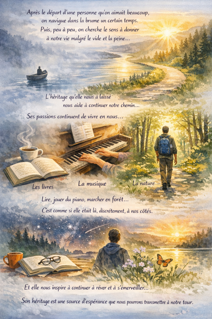En terminant, j’aimerais donner quelques exemples d’héritages qui me font du bien. Entre autres, Louise avait la passion de la musique, des livres, de la nature et de la marche en forêt. Pour conserver ces héritages, j’ai commencé des leçons de piano, je lis et relis des livres et des textes qu’elle aimait, je parcours les sentiers qu’elle aimait. Pendant ces moments, elle m’accompagne discrètement tout en me permettant de continuer ma vie.