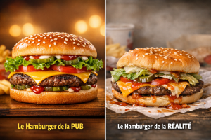 Je suis persuadé que le hamburger de la publicité passe plus de temps au maquillage qu’une vedette de cinéma avant un gala. On le bichonne, on le vaporise, on le photographie sous son meilleur angle… et nous, pauvres mortels, on hérite de son cousin fatigué.