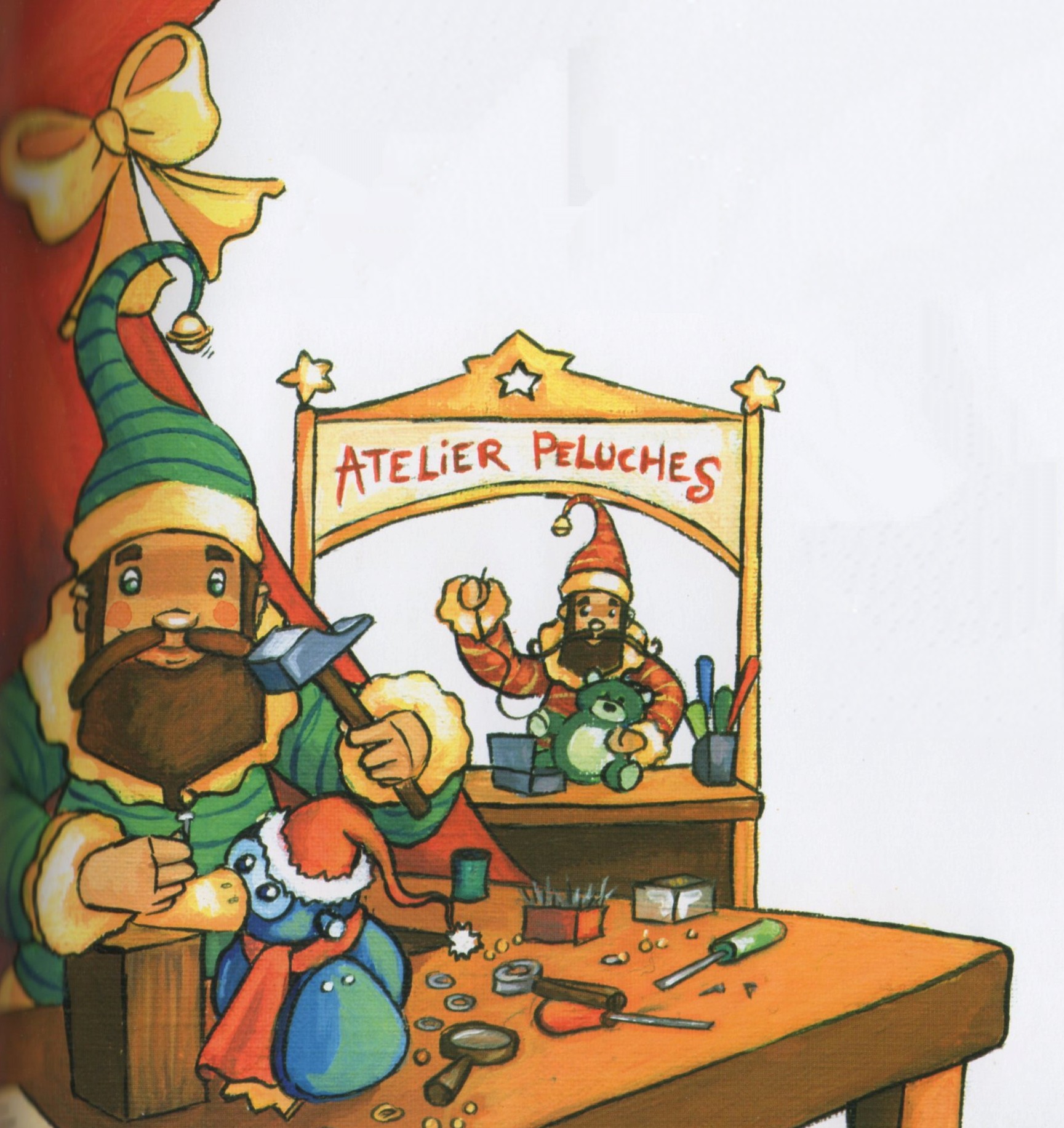 Dans un joyeux brouhaha, les lutins s’installent sur les bancs de la salle, décorée de rouge et d’or comme un théâtre. Et le moment tant attendu arrive enfin : Balthazar, le lutin en chef, se lève et frappe trois coups sur son pupitre.