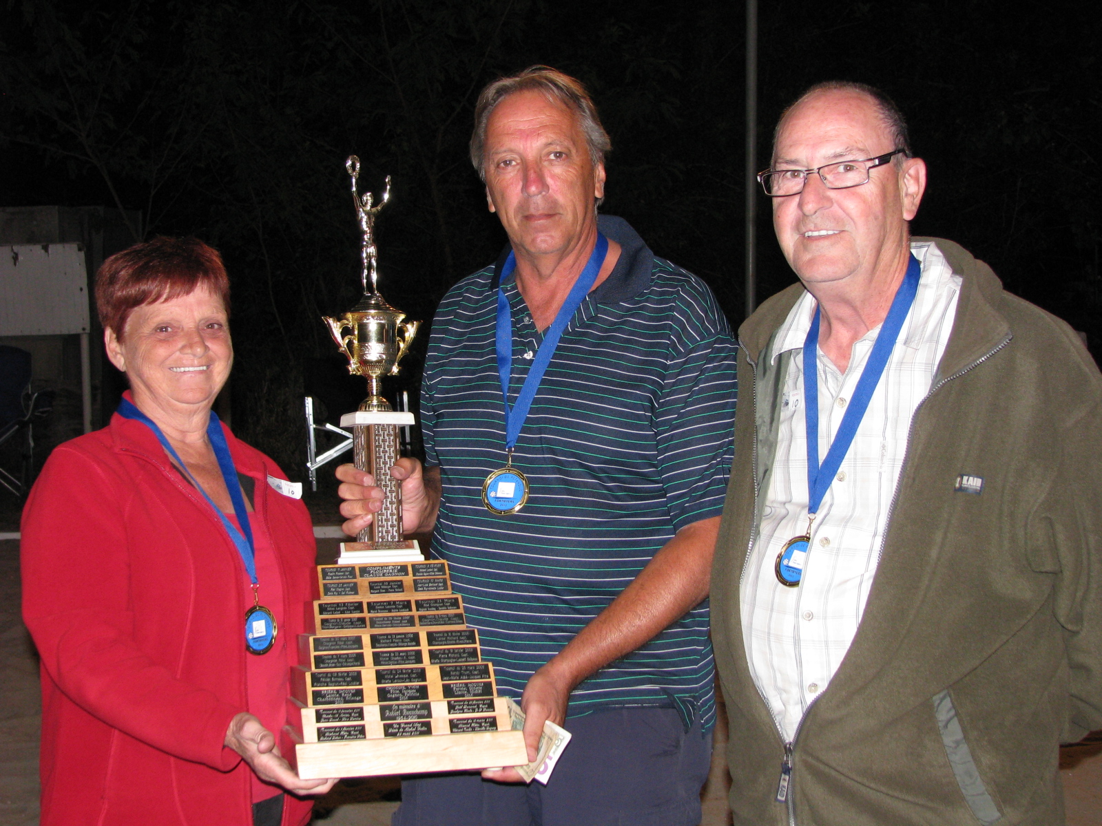 Solide performance aussi de Danielle Thibault, Denis Poirier et du valeureux capitaine Jacques Therrien qui ont décroché l’argent. Enfin, la palme est allée à l’équipe du capitaine Claude Courval, flanqué de Bernard Morin et Nicole Poirier, qui se sont emparés de la médaille d’or et du précieux trophée emblématique. Par le fait même, Claude, qui est passé maître avec sa conjointe, dans l’art de couper les oignons pour accompagner nos succulents hotdogs, réalisait un vieux rêve d’immortaliser enfin son nom sur le trophée.