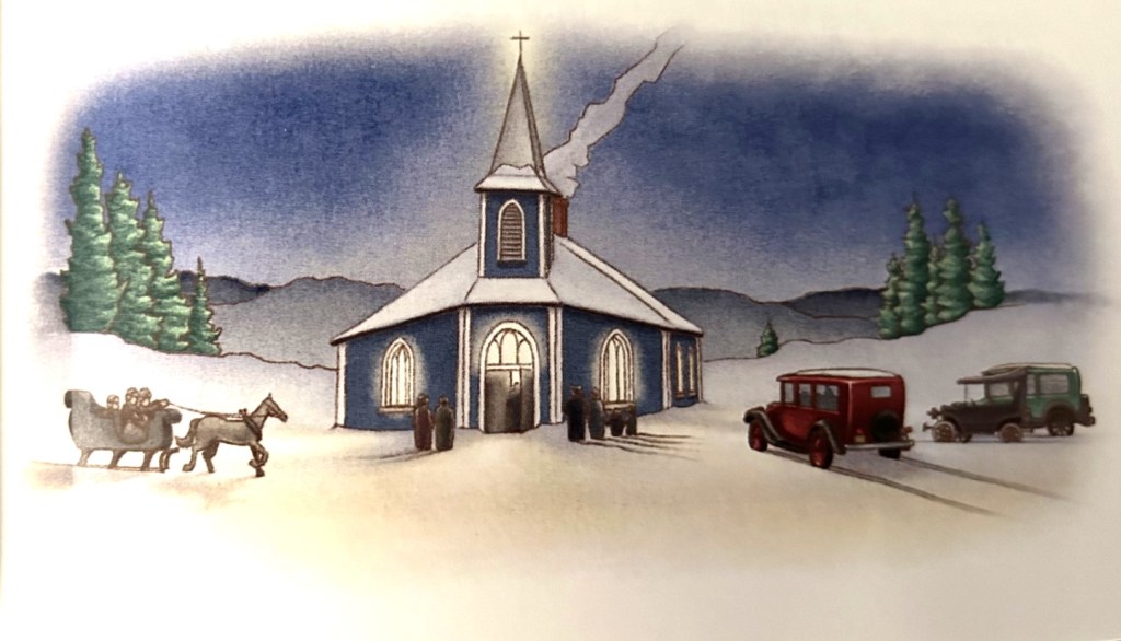 Le 24 décembre arriva finalement. Cette nuit-là, de gros flocons de neige tombaient doucement sur le beau village de Saint-Espoir. Les paroissiens se dirigèrent allègrement vers l’église illuminée, les uns à pied, certains avec leur nouvelle automobile, d’autres en jolies carrioles, pour assister à la messe de minuit.